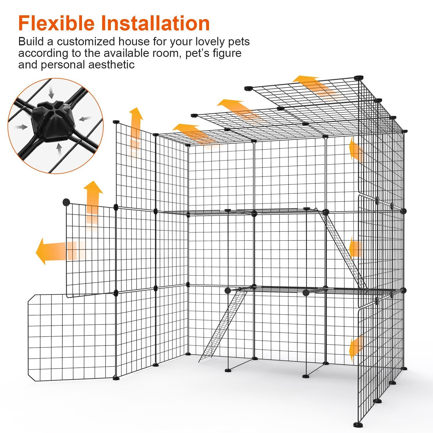 *Spacious Cat Playpen*:Our 3-Tier,3-Column,3-Row cat playpen cage measuring 41.73x41.73x41.73in(L x W x H) in size,provides spacious exploring and resting space for your furry friends to play,climb,sleep,drink,eat,and it can also be used as a warehouse to store plenty of cat supplies to help keep the messy cat stuffs in well organized. This large cat enclosure can easily hold cat hammock,cat tree,litter box,feeding bowl and etc..