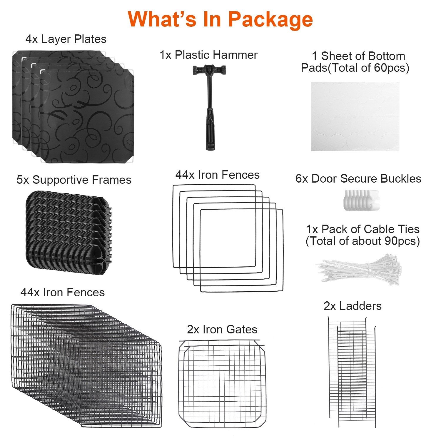 *Stable Iron Construction*:Constructed by thickened iron square grids fixed by sturdy plastic buckles and cable ties,this indoor cat playpen has excellent durability and stability. Come with 4pcs layer plates for resting,each tier can withstand about 11lbs load capacity,won’t crack,bend or fall apart easily. This large metal pet fence ensures long lasting service life and can accompany your cat from kitten to senior.