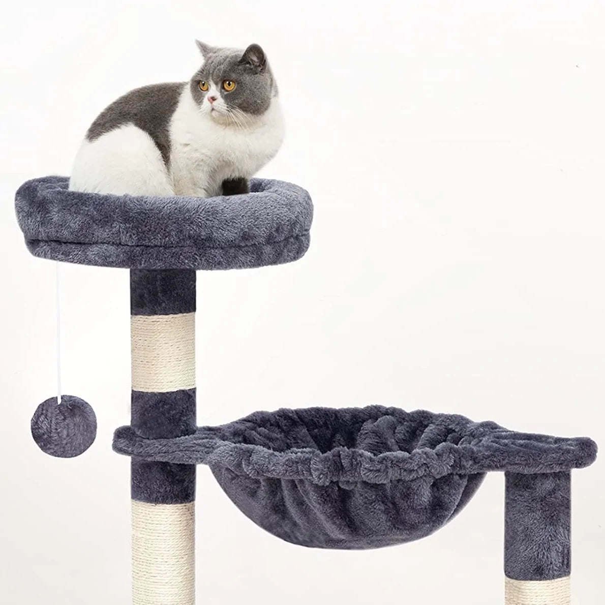 Cat Tree House Scratching Post with hammock and hanging toy is a purrfect gymnastics play ground for scratching; resting and climbing. The hammock is comfortable and provides a safe and cozy spot for cats to relax.