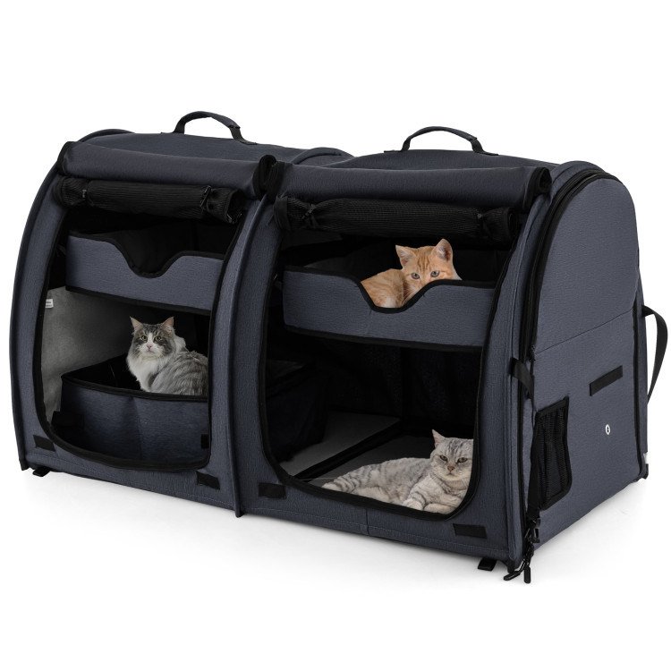 1.Versatile Twin Compartment Design: The large pet carrier features 2 large rooms, which are separated by a zipper, allowing you to carry multiple pets together. Besides, the 2 rooms can be used as a pet house and cat litter box respectively. Or you can unzip the zipper and form a spacious single compartment for large pets to meet diverse needs.