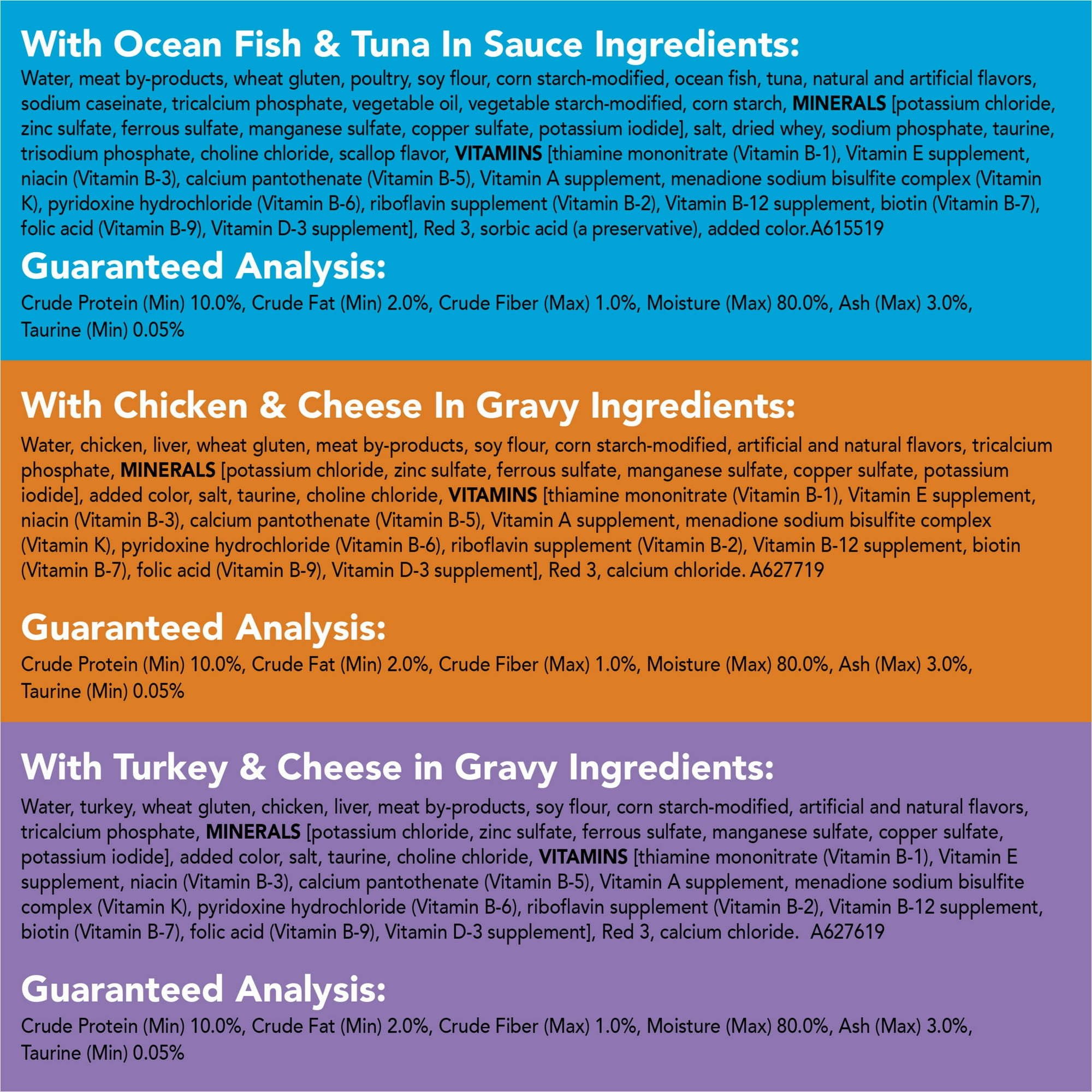 Purina Friskies Tasty Treasures Wet Cat Food Variety Pack, Stock up on a variety of your cat's favorite foods with this Purina Friskies Tasty Treasures wet cat food variety pack. This variety pack contains three purr-fectly delicious recipes, including Tasty Treasures With Chicken Liver in Gravy, With Turkey Liver in Gravy, and With Ocean Fish Tuna in Sauce and Scallop Flavor, delivering the poultry and seafood flavors she adores. Tender, shredded bites offer a palate-pleasing texture all covered in a savory gravy or sauce that's sure to have even your most discerning feline lick her dish clean.