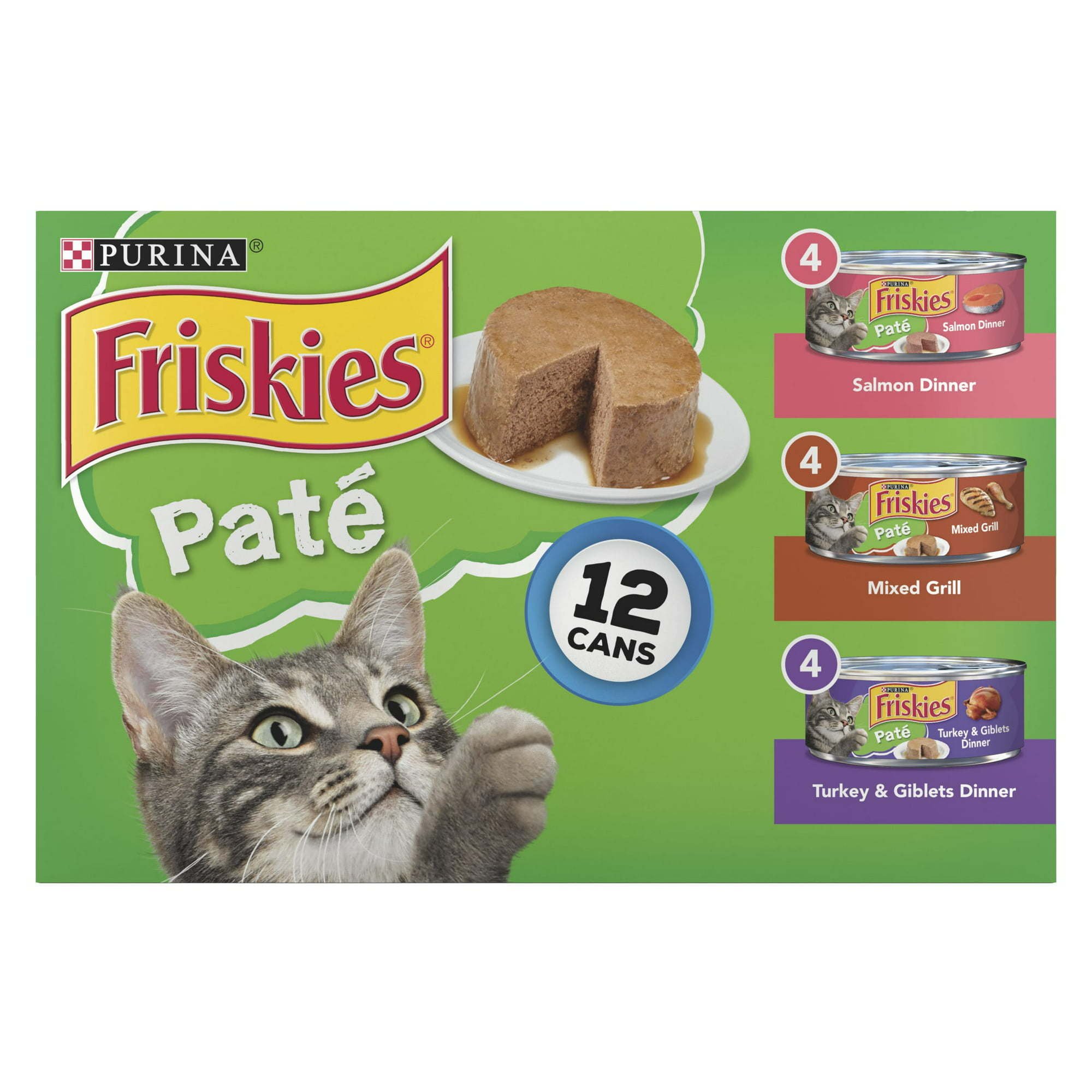 Make your cat's mouth water when you serve up a can from this Purina Friskies Wet Cat Food Pate Variety Pack Salmon, Turkey and Giblets Mixed Grill. Each package contains Pate Salmon, Pate Turkey and Giblets, and Pate Mixed Grill canned cat food pate recipes, all with a tender cat food wet pate texture she loves. Every serving from this Friskies wet cat food variety pack provides vitamins and minerals, delivering 100 percent complete and balanced nutrition for adult cats and letting you feel good about the foods you put in her dish. The delectable Friskies cat food flavor combinations satisfy her desires for savory poultry and delicate seafood. Purina believes that life is better with pets, and they know you want only the best for your cat. That's why Purina uses high-quality ingredients in every serving and strives to make quality the top priority in everything they produce. This Friskies wet cat food is formulated to meet or exceed industry standards for cat foods, so you can feel confident she's getting the delicious, nutritious meals you expect from a trusted brand. Each batch undergoes rigorous quality and safety checks at every step in the production process to give you added peace of mind. Sustainability is a core concept at Purina, and they see that commitment through by seeking out responsibly sourced ingredients and eco-friendly product packaging when possible. Every can in this Friskies wet cat food collection is recyclable, helping you to do your part for the environment while giving your cat the tasty meals she craves. Offer up a serving from this Purina Friskies wet canned cat food Pate variety pack at mealtime and show your cat just how much you care about her health and happiness.
