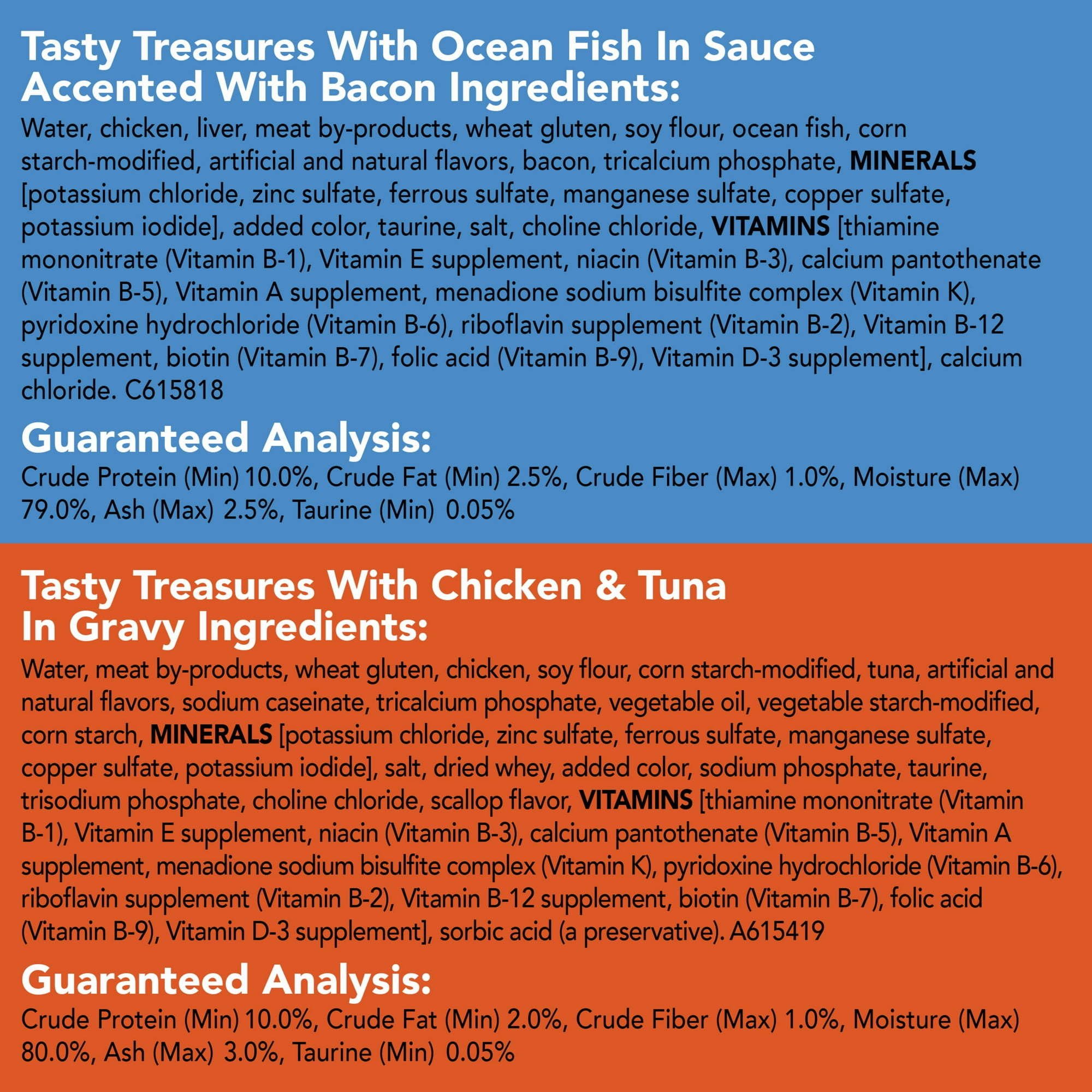 Purina Friskies Ocean Of Delight Wet Cat Food Variety Pack, Watch your feline friend come bounding to her dish when you open a can from the Purina Friskies Oceans of Delight wet cat food variety pack. Containing 10 cans each of four delectable recipes, including Tasty Treasures Prime Filets With Chicken and Tuna in Gravy, Indoor Flaked Ocean Whitefish Dinner With Garden Greens in Sauce, Prime Filets With Ocean Whitefish and Tuna in Sauce, and Tasty Treasures Prime Filets With Ocean Fish and Tuna in Sauce (Scallop Flavor), this Purina cat food variety pack offers the seafood flavors she craves.