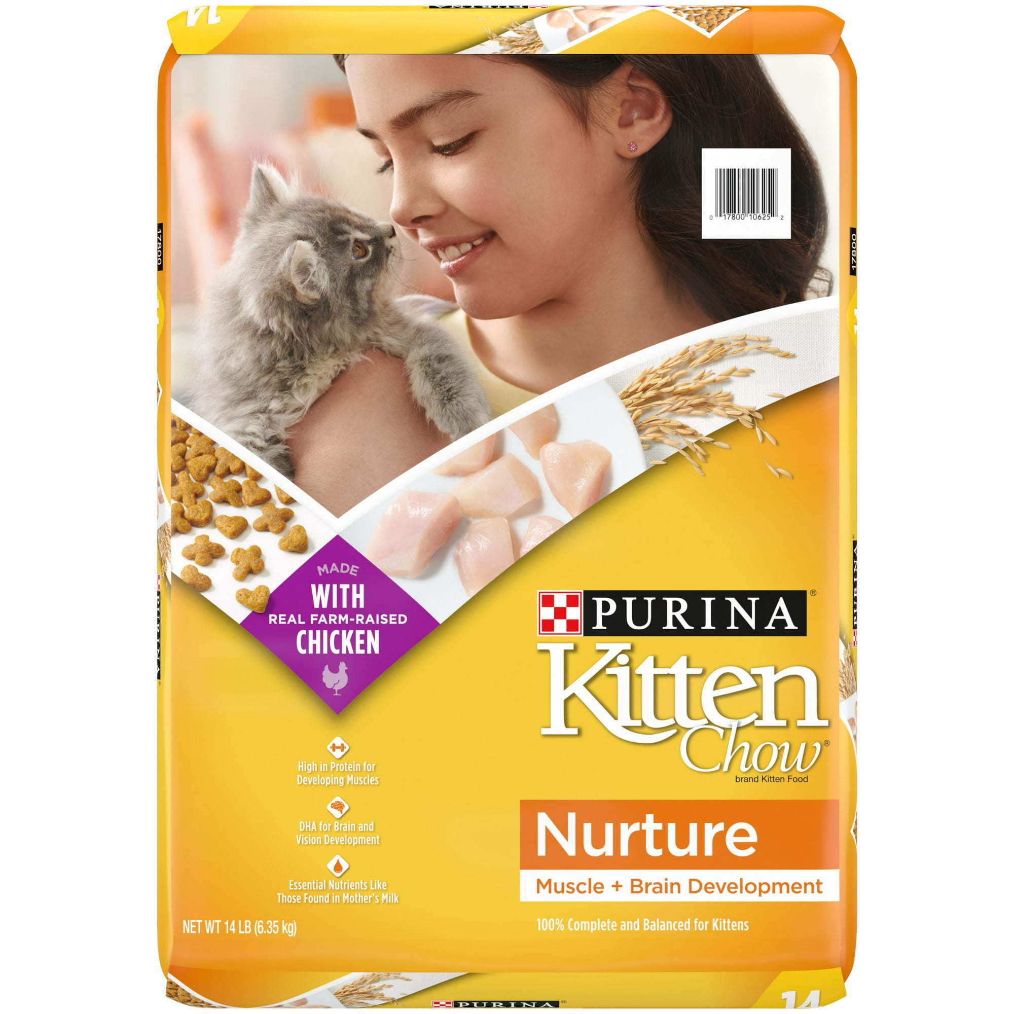 Purina Kitten Chow Nurture Chicken Recipe Dry Cat Food for Kittens, Get your kitten off to a great start with Purina Kitten Chow Nurture dry kitten food. Our high protein kitten food contains essential nutrients like those found in mother's milk to help your kitten grow healthy and strong. High-quality protein, including real farm-raised chicken, helps support the development of lean muscles. Plus, DHA supports her brain and vision development. Because this Purina dry kitten food is made with high-quality ingredients, you can rest easy knowing she's getting great nutrition. The delicious flavor gives her the taste she wants along with a kitten dry food formula made without artificial flavors or colors.