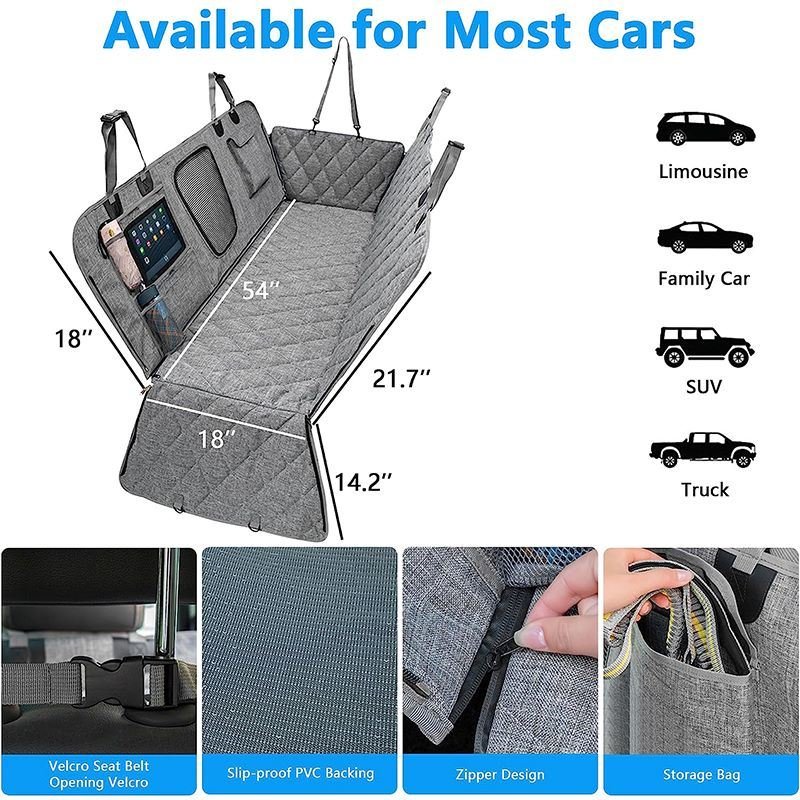 The backseat cover for dogs in the car is made of Oxford cloth, PP cotton, and an anti-slip net.