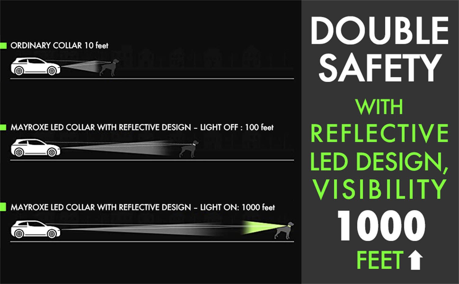 [High visibility and Safe]: MayRoxe dog collar light with excellent brightness can keep you dog be seen by vehicles in advance from 1002 FT; and outstanding illuminated led pass evenly through the collar; be seen from any angle.