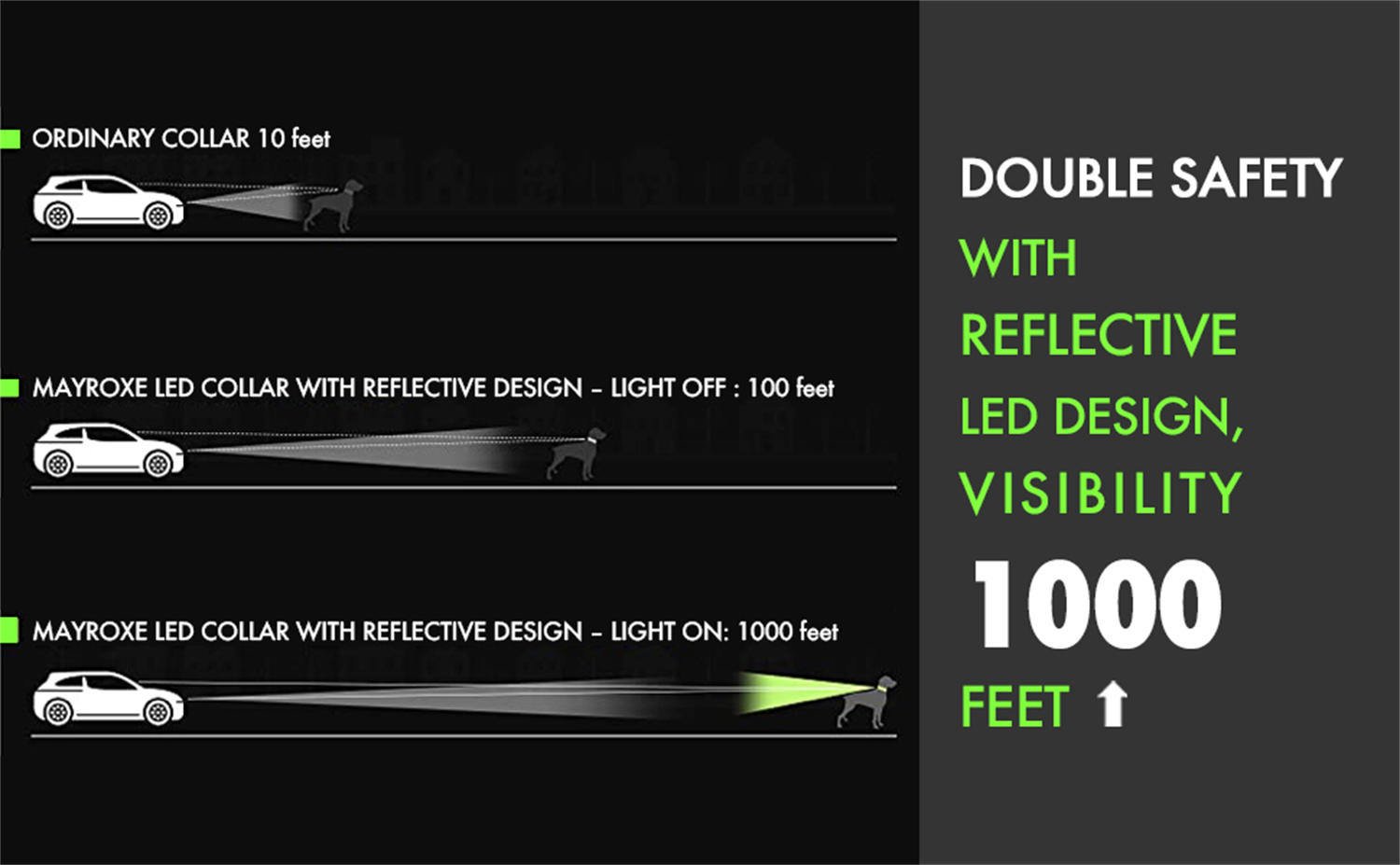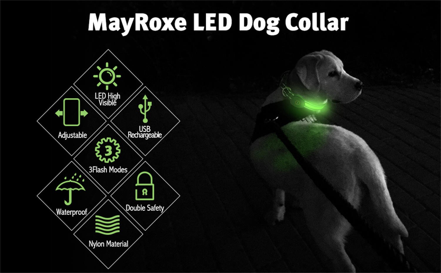 [Triple Safety] The MayRoxe led dog collar is made by nylon material which is very safe for your dog's skin; the reflective strips of the light up dog collars design on both sides can protect dogs even the light of led dog collar rechargeable is off; and the light up dog collars help vehicles see your dog well.