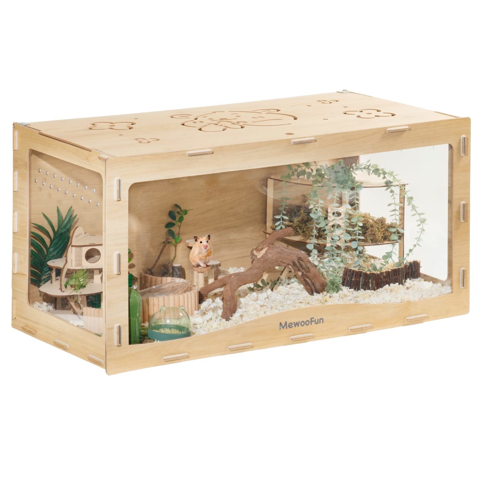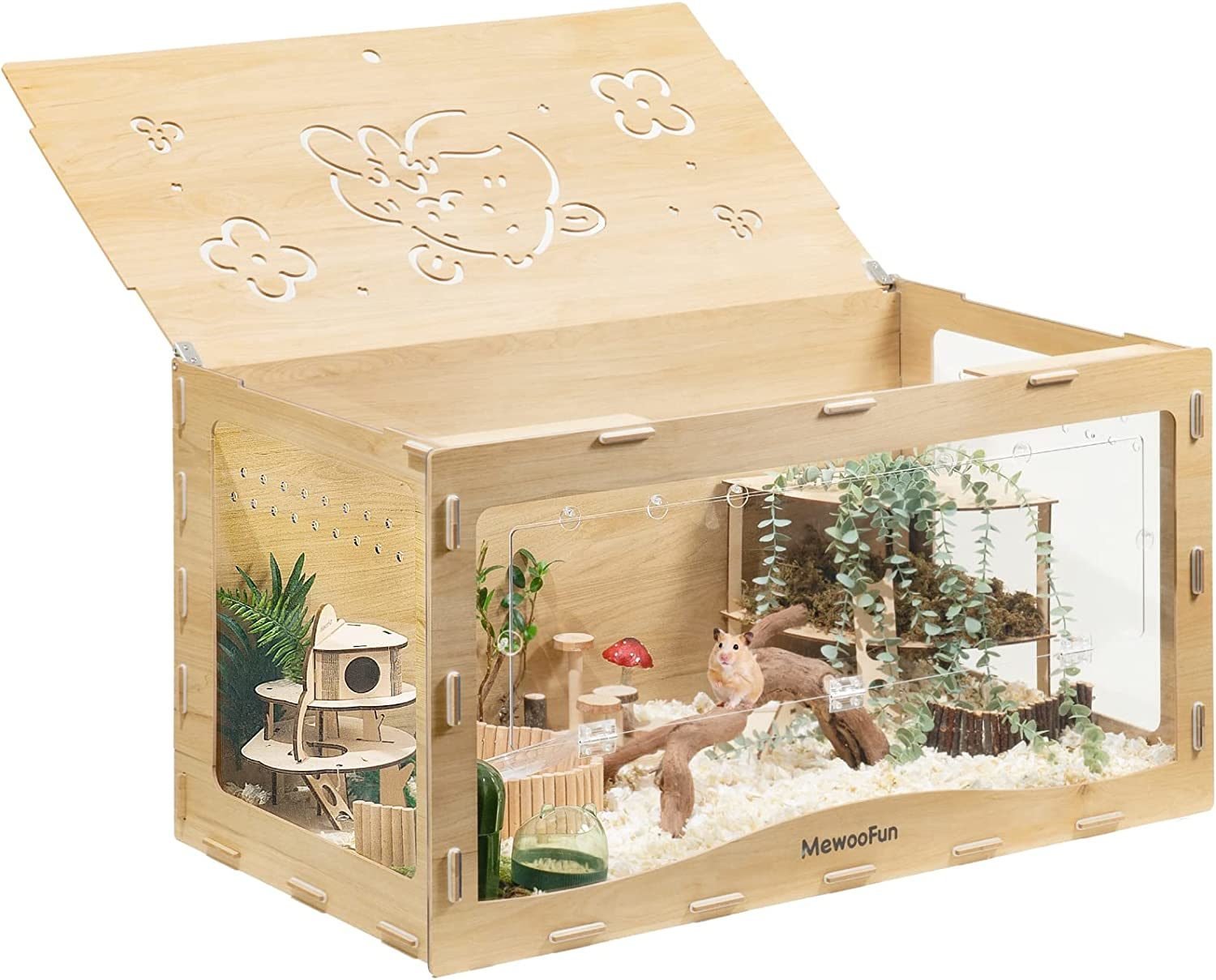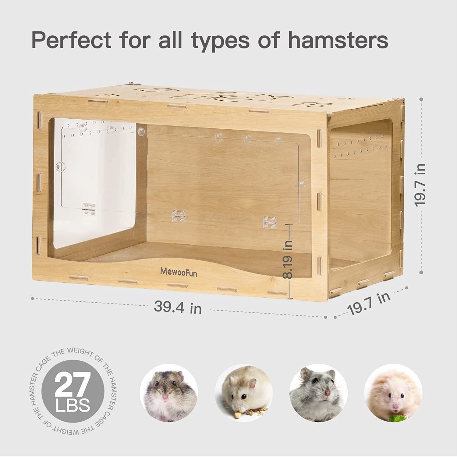 Brand: MewooFunProduct Name: Hamster Cage Color: Wood ColorSuitable for: Gerbil,Hamster,syrian hamsters,                 dwarf hamsters, robo hamsterMaterial: MDF + AcrylicItem Dimensions: 39.4 *19.7 *19.7inch
